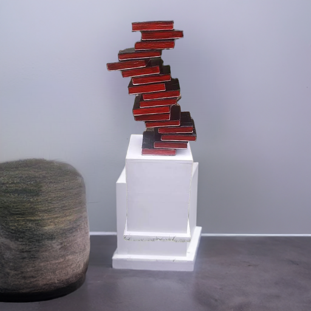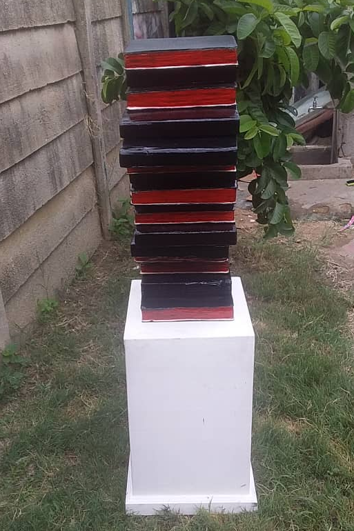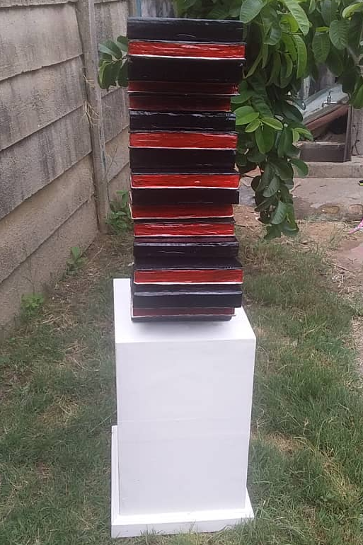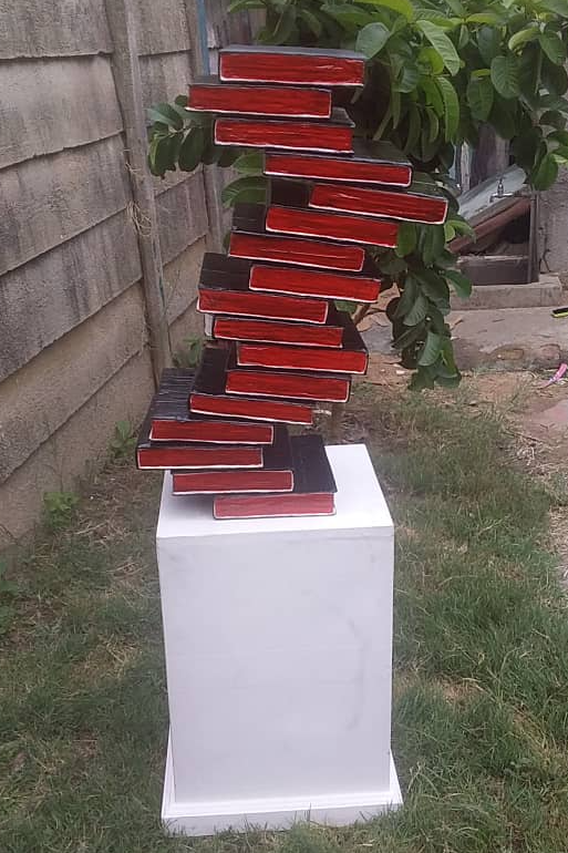 Balanced Word by Zimbabwean artist Given Sitandi is a unique and thought-provoking piece of art. Crafted from cardboard, wood, and acrylic paint and varnish, it depicts a stack of meticulously balanced Bibles that appear strikingly realistic. Mounted on a wooden stand, this rare décor item serves as a subtle tribute to the resilience of the Word of God, making it a meaningful addition for lovers of scripture and symbolic artistry.