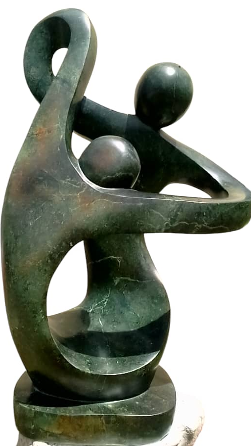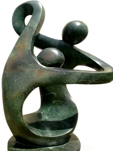 Dancing Time : Get lost in the rhythmic beauty of "Dancing Time", a captivating abstract stone sculpture that celebrates the joy of movement and connection, crafted from vibrant Green Opal by Zimbabwean artist Givemore Mashaya. This dynamic piece masterfully captures the essence of a dancing couple, their bodies blending together in a swirling motion of love and harmony. The fluid, curvilinear forms seem to pulse with energy, as if the music is still resonating through the stone. The Green Opal's lush, verdant hues add a sense of vitality and freshness to the sculpture, making it a mesmerizing addition to any space. "Dancing Time" is a testament to the power of dance to bring people together and transcend the ordinary.