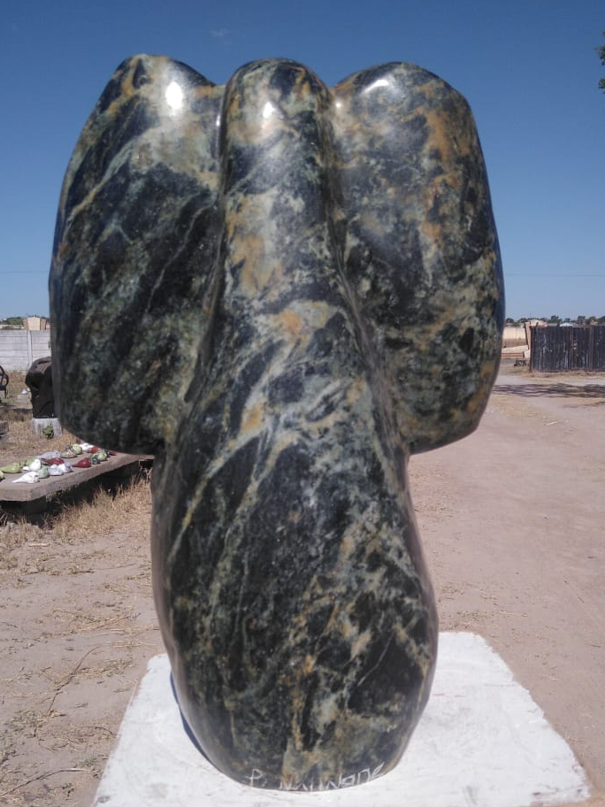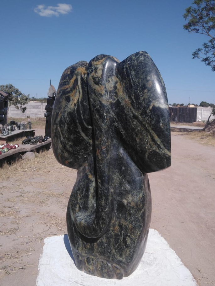 Elephant – A stunning stone sculpture expertly crafted from serpentine stone by Zimbabwean artist Pelagia Nkiwane. This elegantly simple piece features smooth, flawless lines that reflect the gentle strength and majesty of the elephant. The sculpture's beauty is elevated by the natural variations in the hues and textures of serpentine stone, giving it depth and character.