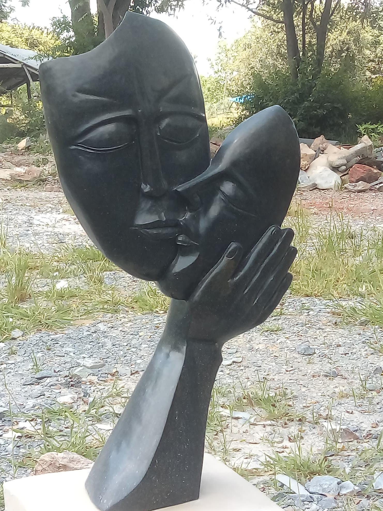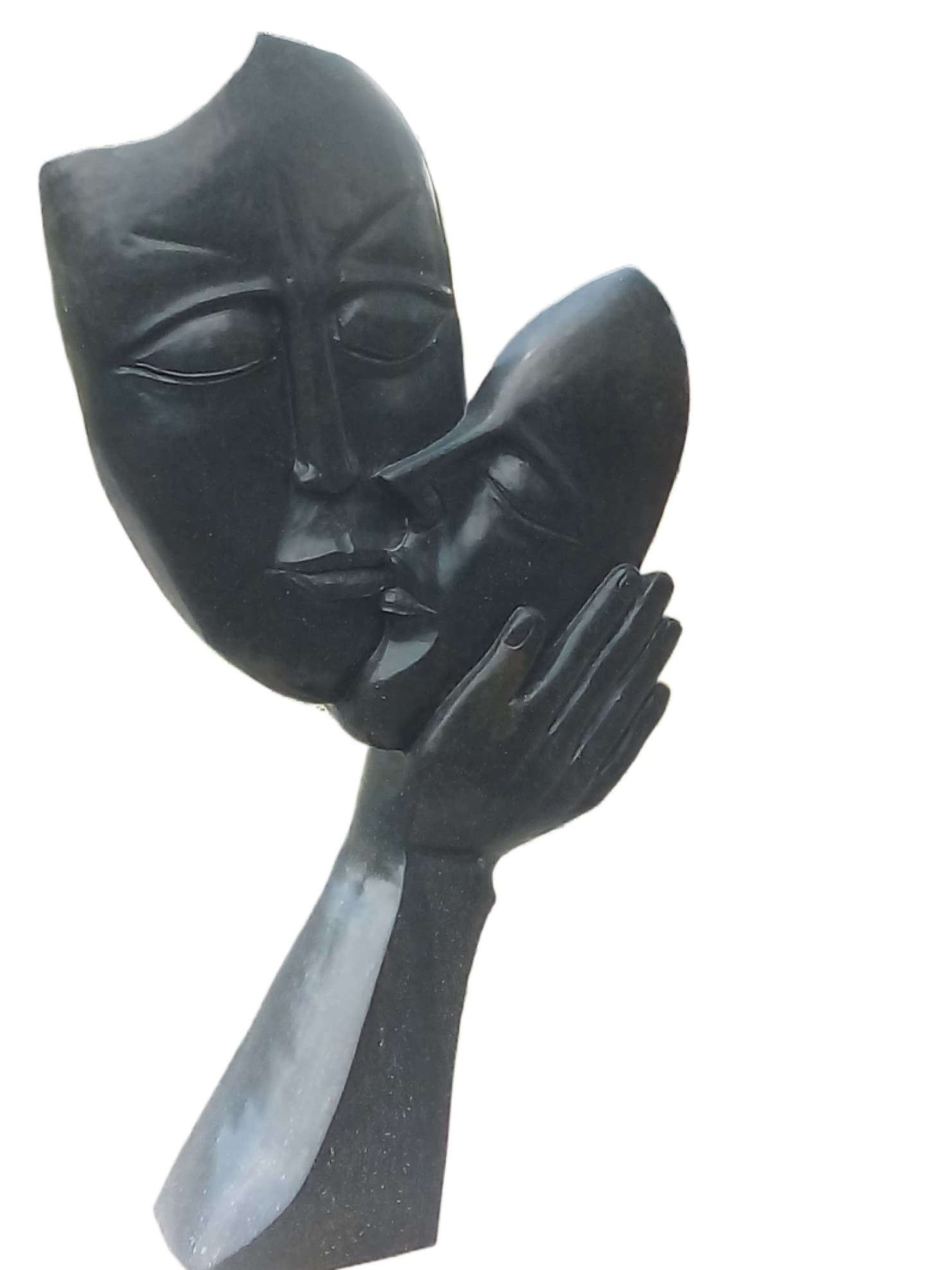 First Kiss: Experience the tender magic of a romantic moment with "First Kiss", a exquisite stone sculpture that captures the sweet intimacy and hesitation of that unforgettable instant, crafted from rich, dark Springstone by Zimbabwean artist Farai Tandi. This delicate piece masterfully conveys the emotional tension and excitement of a couple about to share their first kiss, suspending time in a tender, heartbreaking moment of anticipation. Every detail, from the gentle tilt of the head to the soft, hesitant touch, is infused with a sense of vulnerability and longing, making this sculpture a poignant reminder of the beauty and uncertainty of new love.