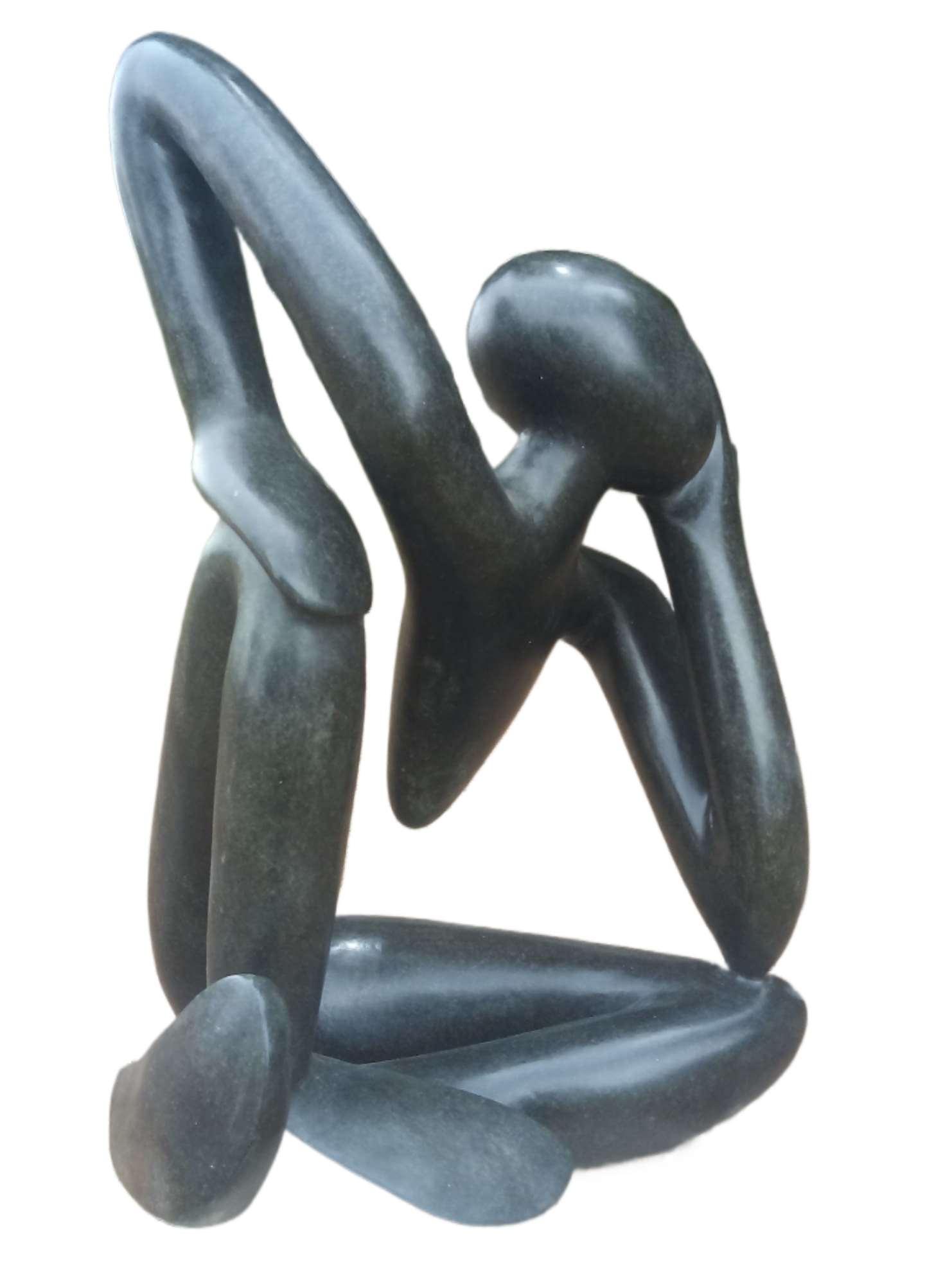 Lost In Thought: Step into the world of introspection with "Lost In Thought", a poignant stone sculpture that captures the essence of deep contemplation, crafted from rich, dark Springstone by Zimbabwean artist Stephen Chikeya. This evocative piece masterfully conveys the intensity of the human mind, as a figure becomes completely absorbed in thought, oblivious to the world around them. The subtle yet powerful posture - elbow resting on knee, head resting in hand - exudes a sense of profound introspection, as if the weight of the world is being carefully considered. This unique sculpture invites the viewer to pause, reflect, and connect with their own thoughts and emotions, making it a truly introspective and thought-provoking addition to any space.