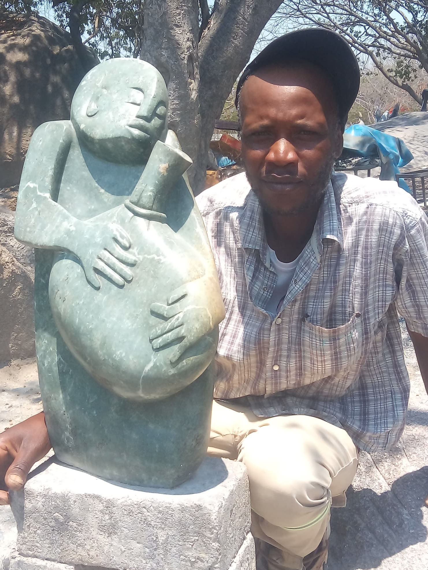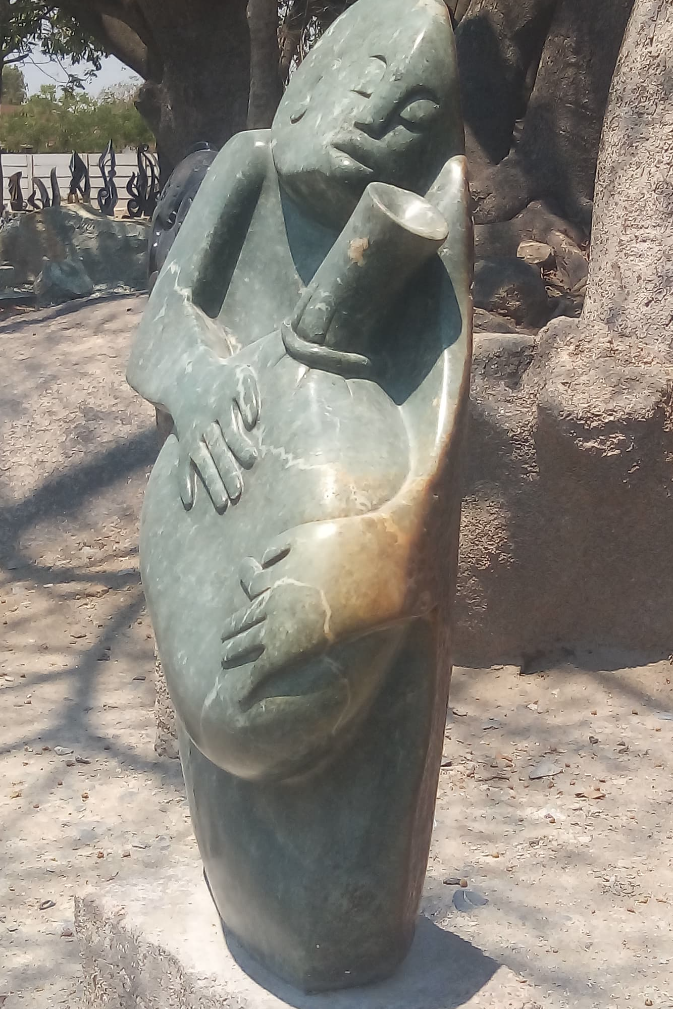 Treasure Trove – This Stone Sculpture Made of Opal Stone by Melody Fombe from Zimbabwe portrays the moment of discovery, with a figure clutching tightly to a bag or container filled with treasure. Crafted from opal stone, the piece symbolizes hope, ambition, and the pursuit of dreams waiting to be realized. It serves as both a visual representation of aspiration and a reminder to hold fast to what matters most.