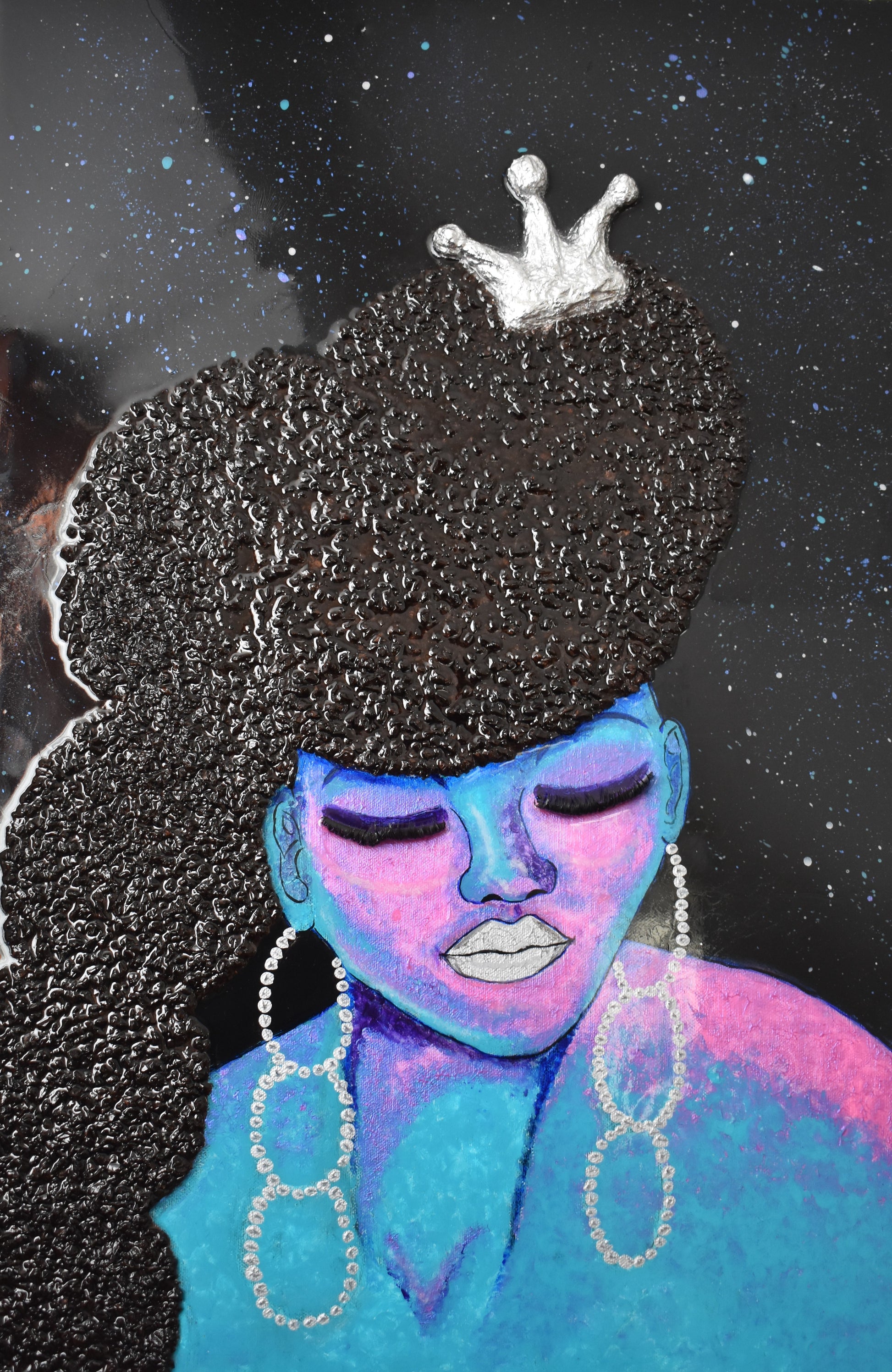 'Mystique' Many times I feel like natural beautiful is out of this world and not shown and appreciate as much as it should be, so I created this stunning piece showing the world how beautiful she is. 3D mixed media-created with acrylic, tissue paper, silver leaf, eye lashes and secret materials, this piece has a resin finish.