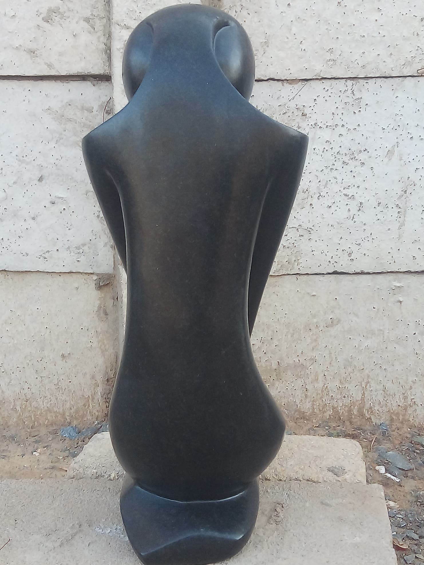 Respect – A powerful stone sculpture crafted from Springstone by Misheck Makaza, this piece elegantly depicts a figure in a bowing posture, embodying reverence and humility. Each curve and contour expresses deep respect, making it a meaningful addition to any space.