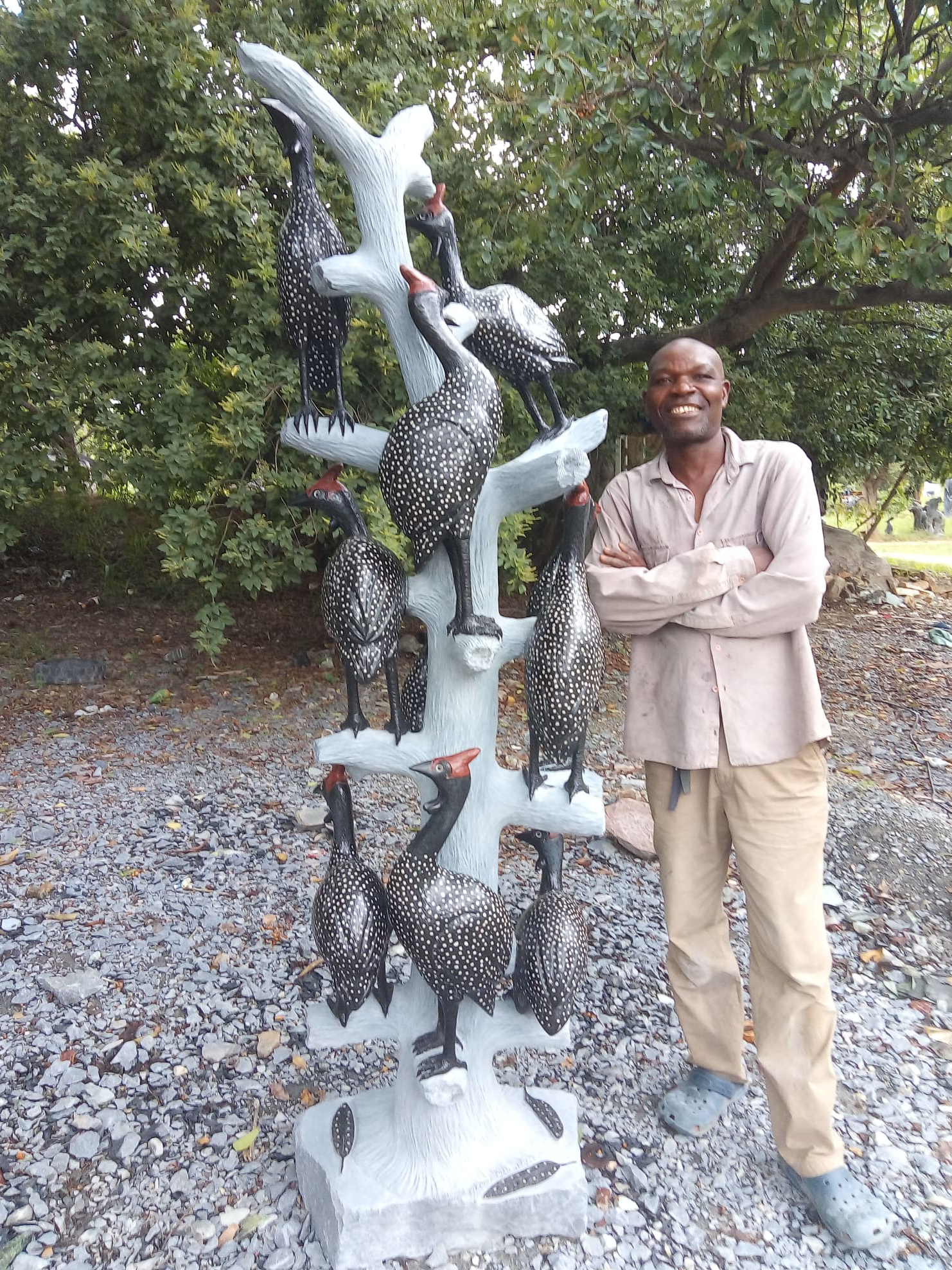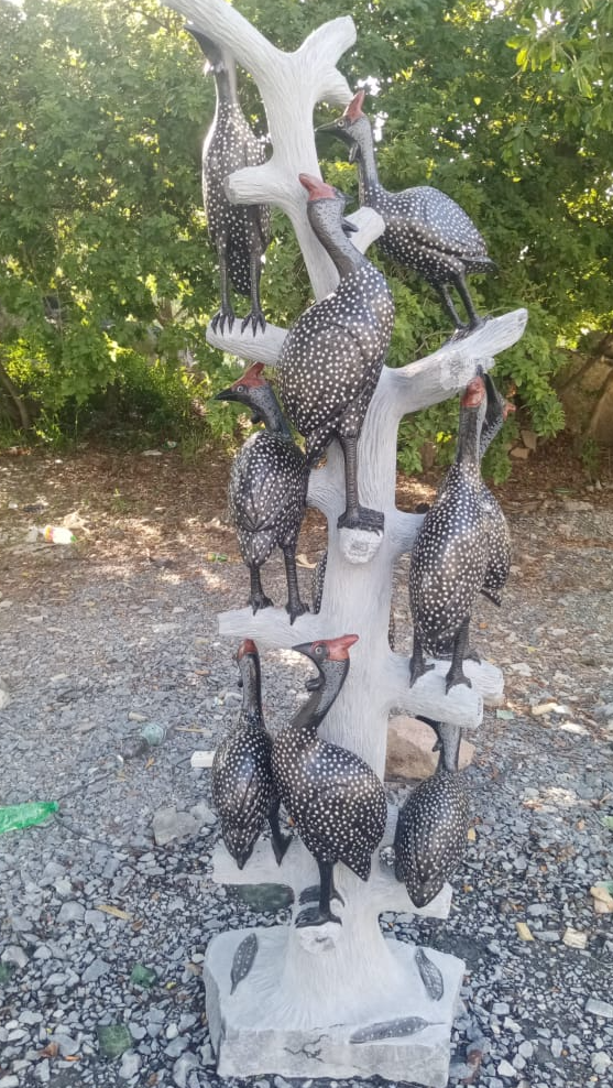 Crafted from Zimbabwean springstone, Roosting Flock depicts a family of ten guinea fowls perched gracefully on their tree. Representing a natural family hierarchy, with the matriarch leading, this sculpture captures the unity and rhythm of guinea fowls moving together in groups. Feather carvings at the base symbolize their permanent resting place—a sanctuary they return to nightly. A true masterpiece, this work exudes peace and calm, making it a perfect centerpiece for any space.