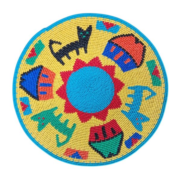 Add a burst of sunshine to your home decor with this vibrant yellow hardwire bowl, expertly woven by Nomvuselelo Mthwalo! The cheerful shade is perfectly complemented by a pop of turquoise trim, while the intricate design features Zulu rondavels and animals, showcasing the rich cultural heritage of Africa. This unique bowl is not only a stunning decorative piece, but also a testament to the skilled craftsmanship of the artist.