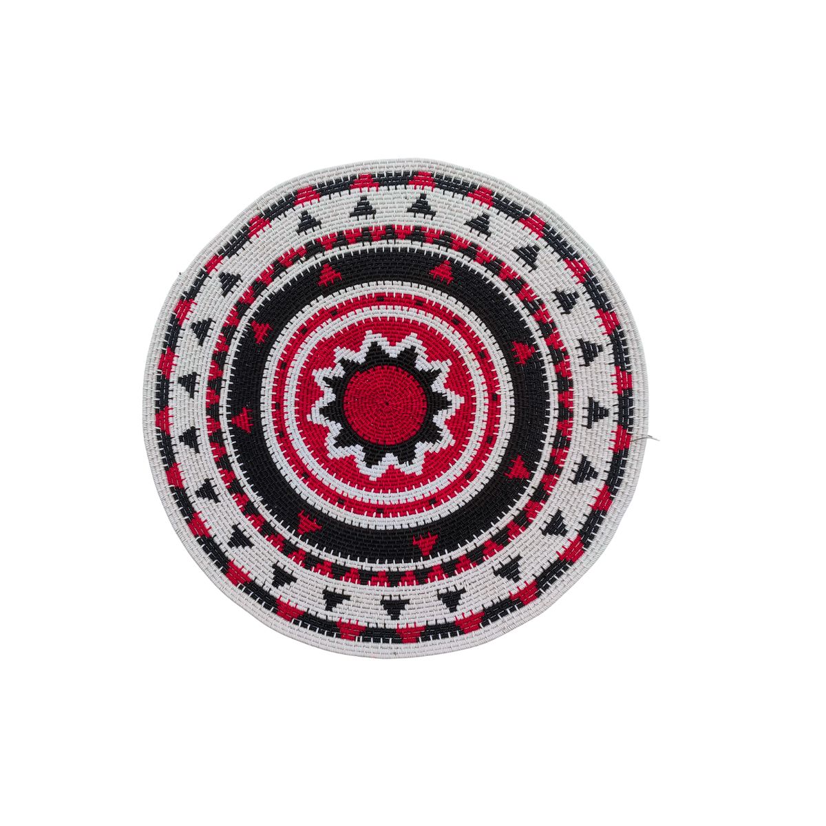 Make a statement with this striking shallow hardwire bowl, handcrafted in South Africa. The bold black, white, and red geometric design creates a mesmerizing visual effect, perfect for adding a touch of modern African flair to your home décor. Measuring 31.5cm in diameter, this unique piece can be displayed as a striking wall hanging or prominent table centerpiece, sure to spark conversation and admiration.