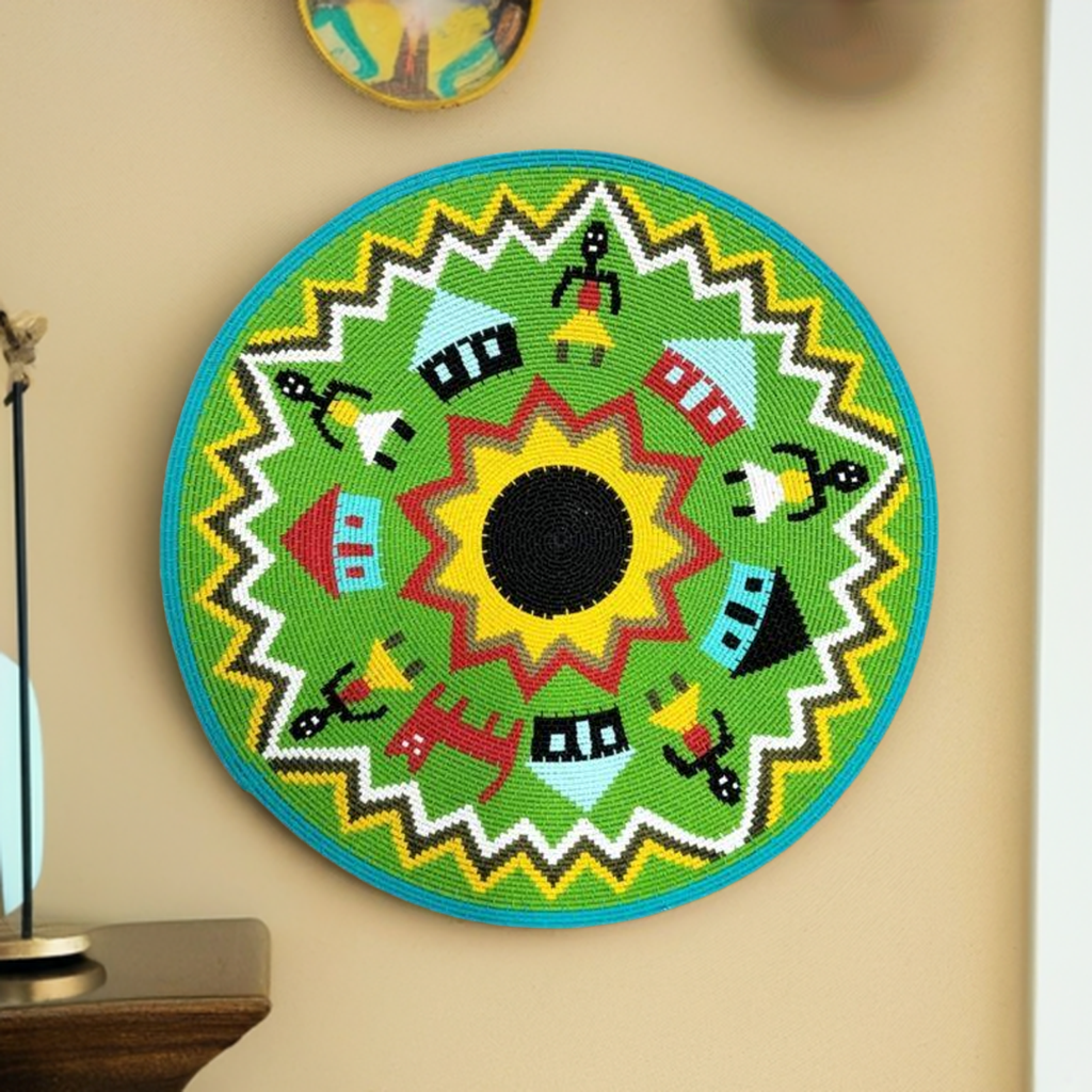 Discover the charm of rural Africa with this beautiful shallow bowl, crafted in Sylvia Ludidi's distinctive style. The vibrant green hardwire creation is adorned with rondavel huts and playful young women, celebrating the joy and simplicity of rural life. Perfect for adding a touch of African zest to your home décor, this unique bowl is a must-have for anyone who loves cultural artistry and whimsical design.