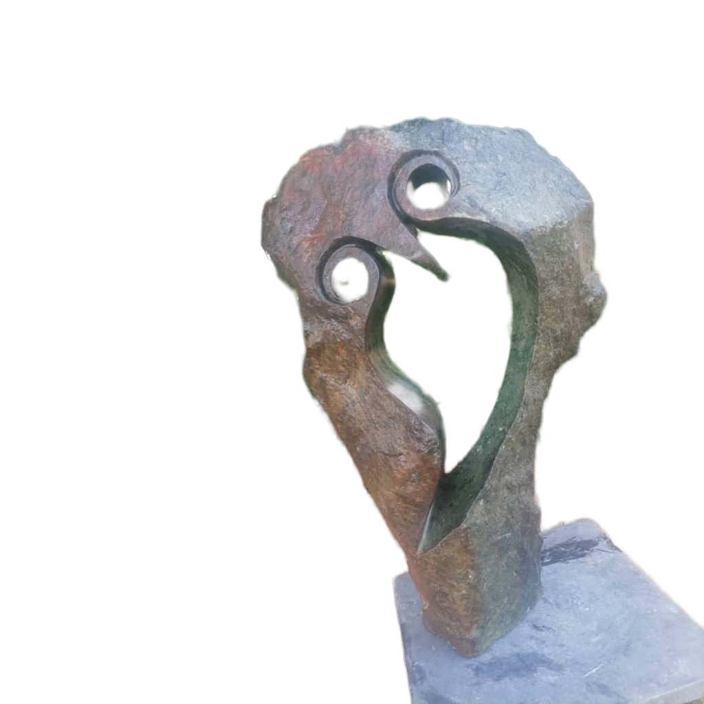 "Silent Vigil" by Addington Nyasoka is a captivating sculpture carved from green opal stone. It beautifully captures the owl's quiet and stealthy nature, invoking a sense of watchfulness and protection. With its unique texture and contrasting hues, this piece is a thought-provoking and visually stunning addition to any contemporary African art collection.