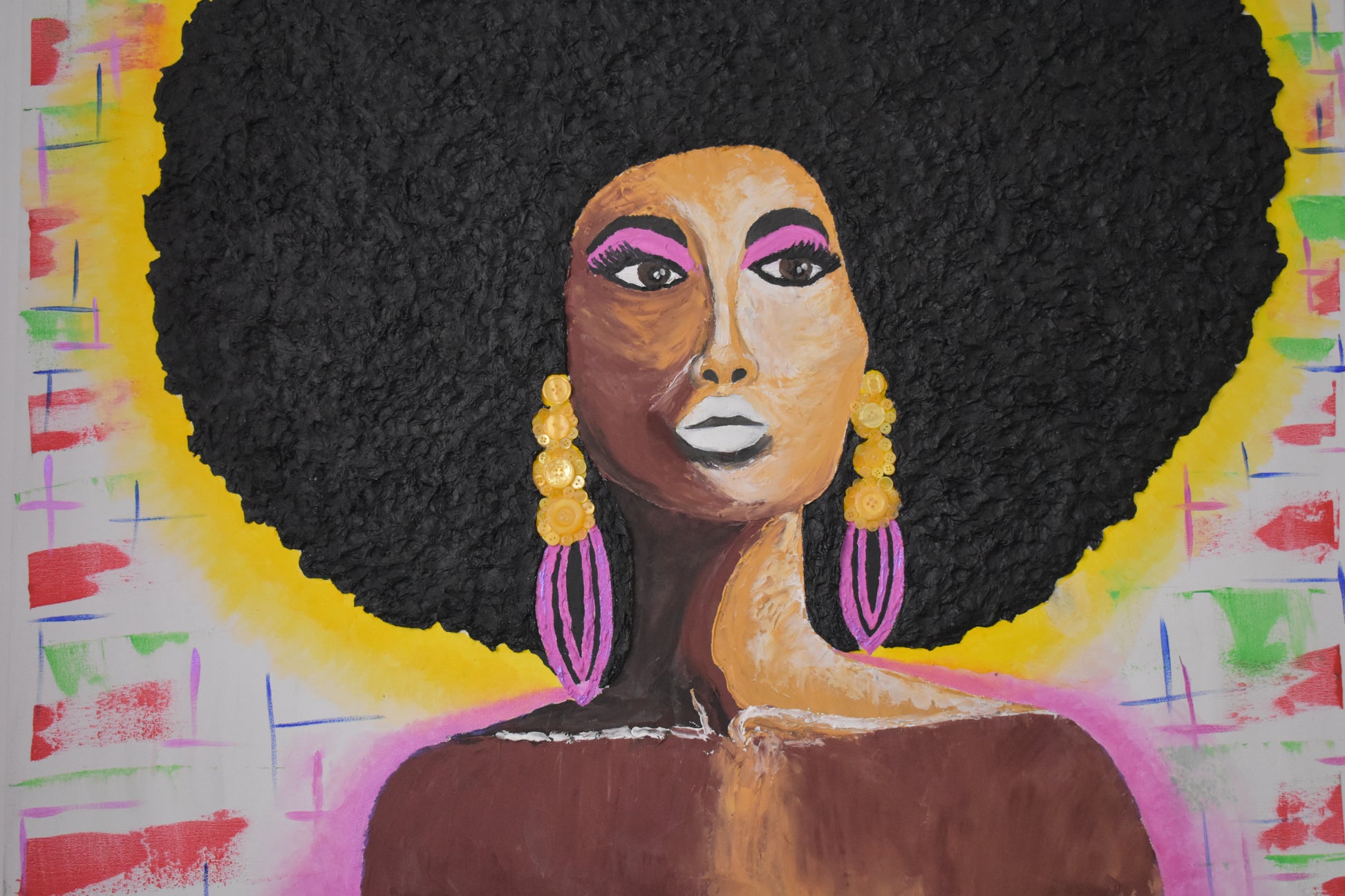 'True Crown' is an unabashed and unapologetic mixed media, 3D art piece that boldly asserts one's hair as the ultimate royalty. Embracing the concept that bigger is better, this work encourages the proud display of one's unique crown. Created with acrylic, buttons, a secret material, and wall filler, this art piece celebrates the regality inherent in every strand of hair.