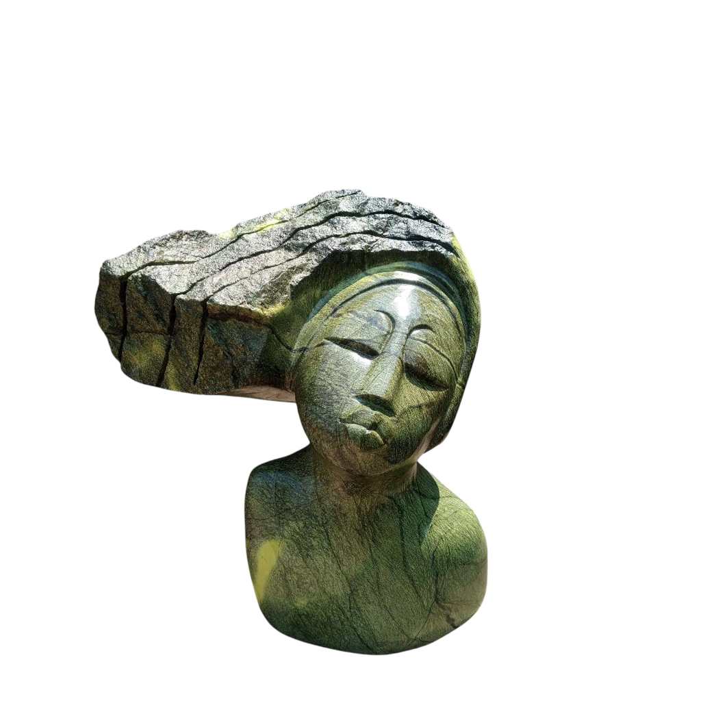 Whispering Breeze is a stunning stone sculpture crafted from rich green leopard rock, capturing the serene beauty of an African woman's bust. Her calm, meditative expression and floating long hair, gently blown by a whispering breeze, evoke a sense of peace and harmony with nature. This exquisite piece embodies grace, strength, and tranquility, making it a captivating addition to any space seeking inspiration and natural elegance.