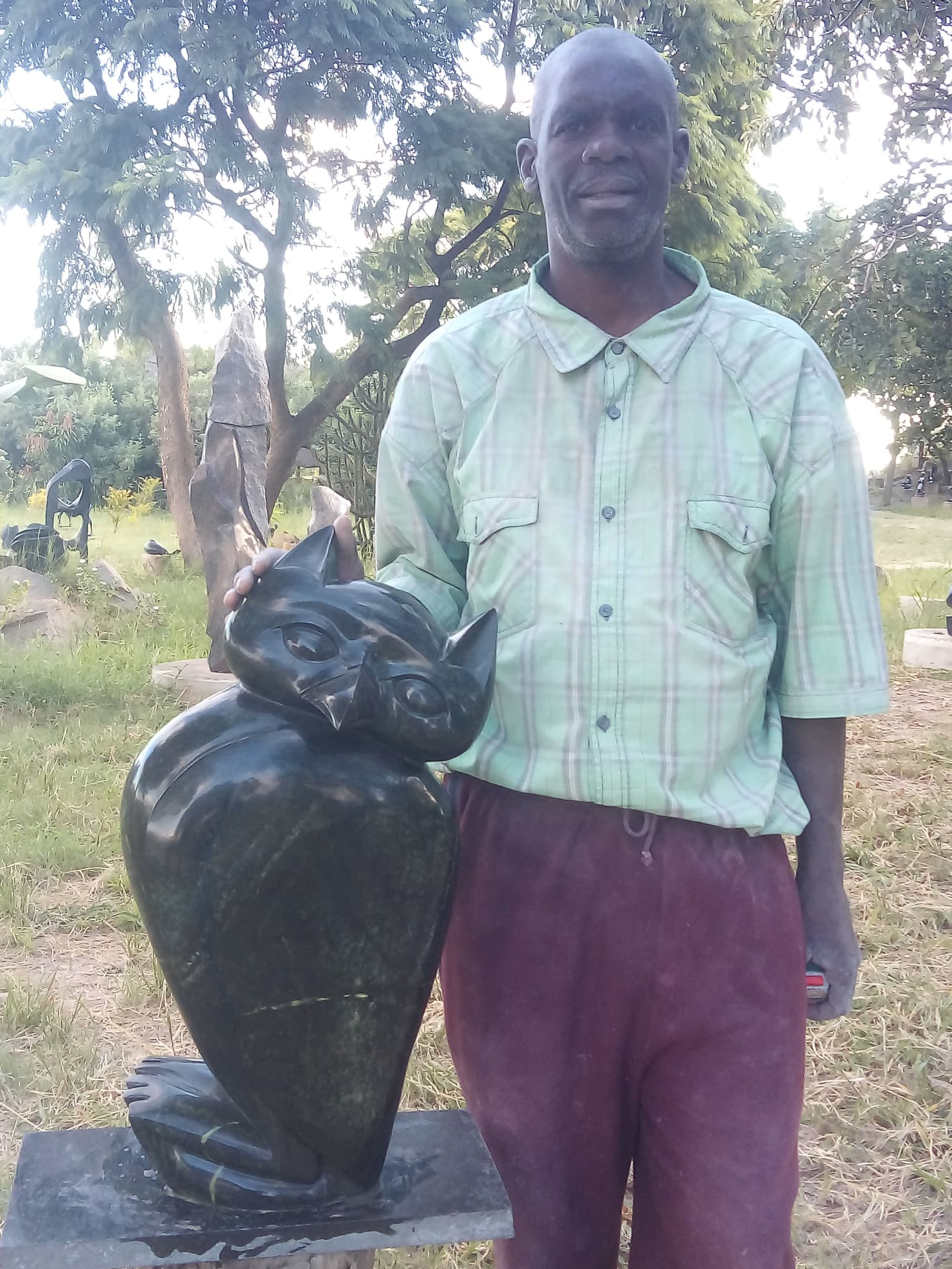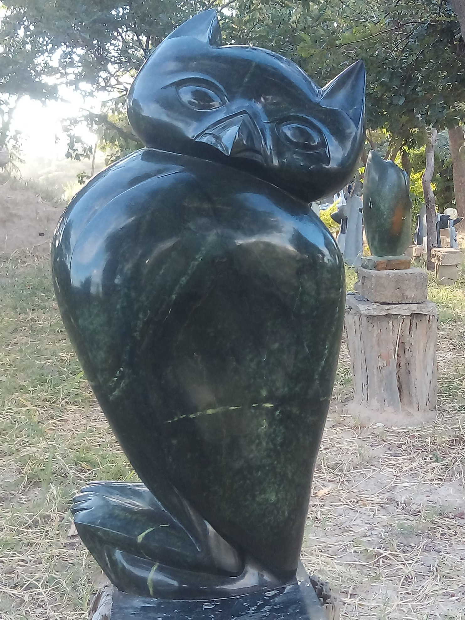 Wise Owl – A masterfully carved stone sculpture by Zimbabwean artist Sidney Majengwa, crafted from authentic Leopard Rock. The naturally dark hues of the stone lend the piece an organic, earthy quality that perfectly captures the majestic essence of an owl—a timeless symbol of wisdom. Meticulously detailed, the sculpture showcases the artist's expertise, with every curve and contour exuding grace and a hint of mystery. Ideal for bird and wildlife enthusiasts, "Wise Owl" is a stunning addition to any collection, bringing both natural elegance and profound symbolism to your space.Couldn't load pickup availability